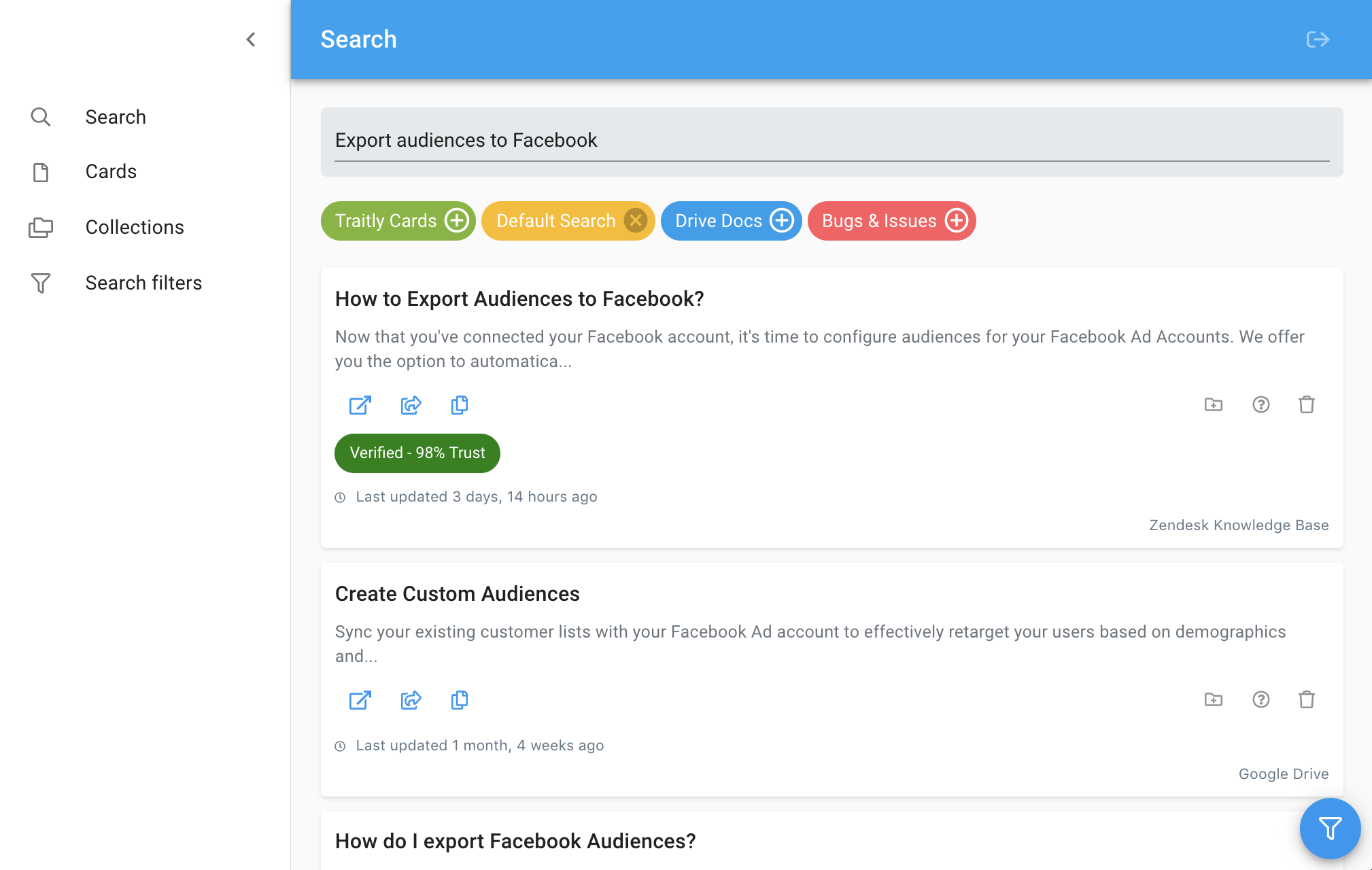 Instantly search across your existing knowledge platforms without switching tabs, anywhere within your browser.