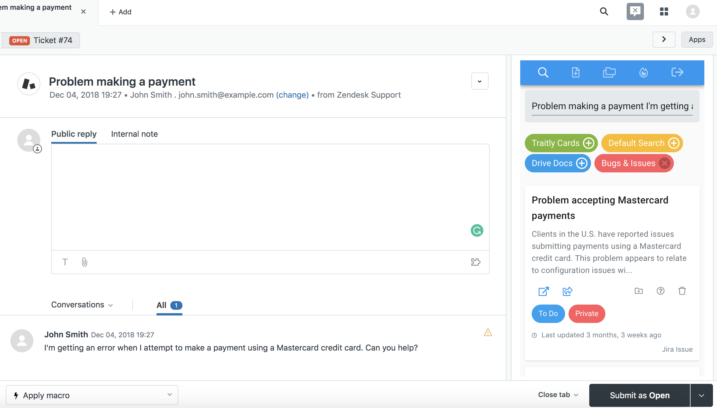 Enable your customer support people to access help docs, team conversations, past cases, bugs and issues all from one place, no matter where they work.